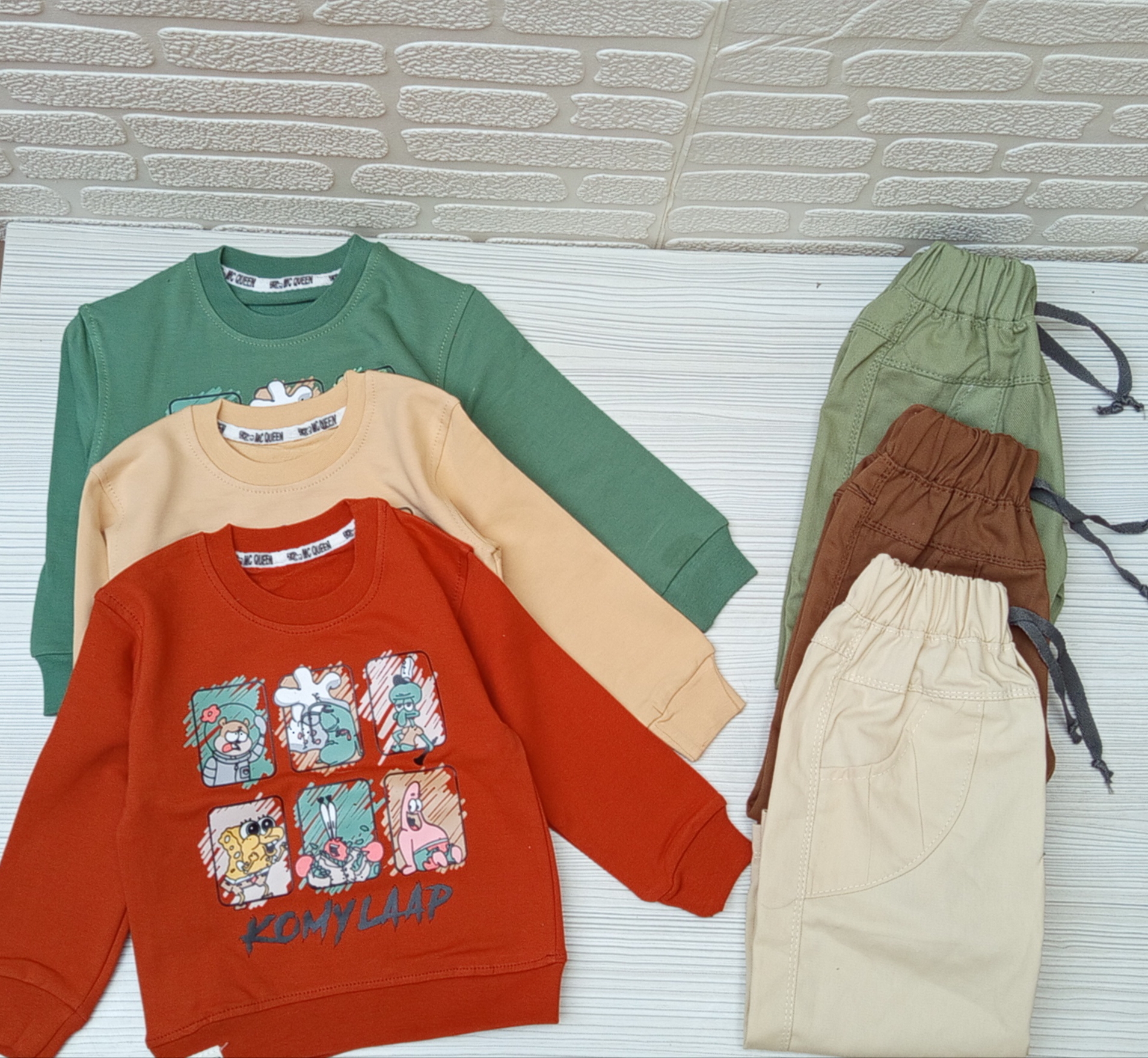 ست بلوز شلوار طرح باب اسفنجی 🌟 رنگبندی سبز، آجری، کرمی🌟 جنس بلوز دورس لاکرا شلوار کتان 🌟 اندازه سایز بندی ها در پایین صفحه درج شده است 🌟